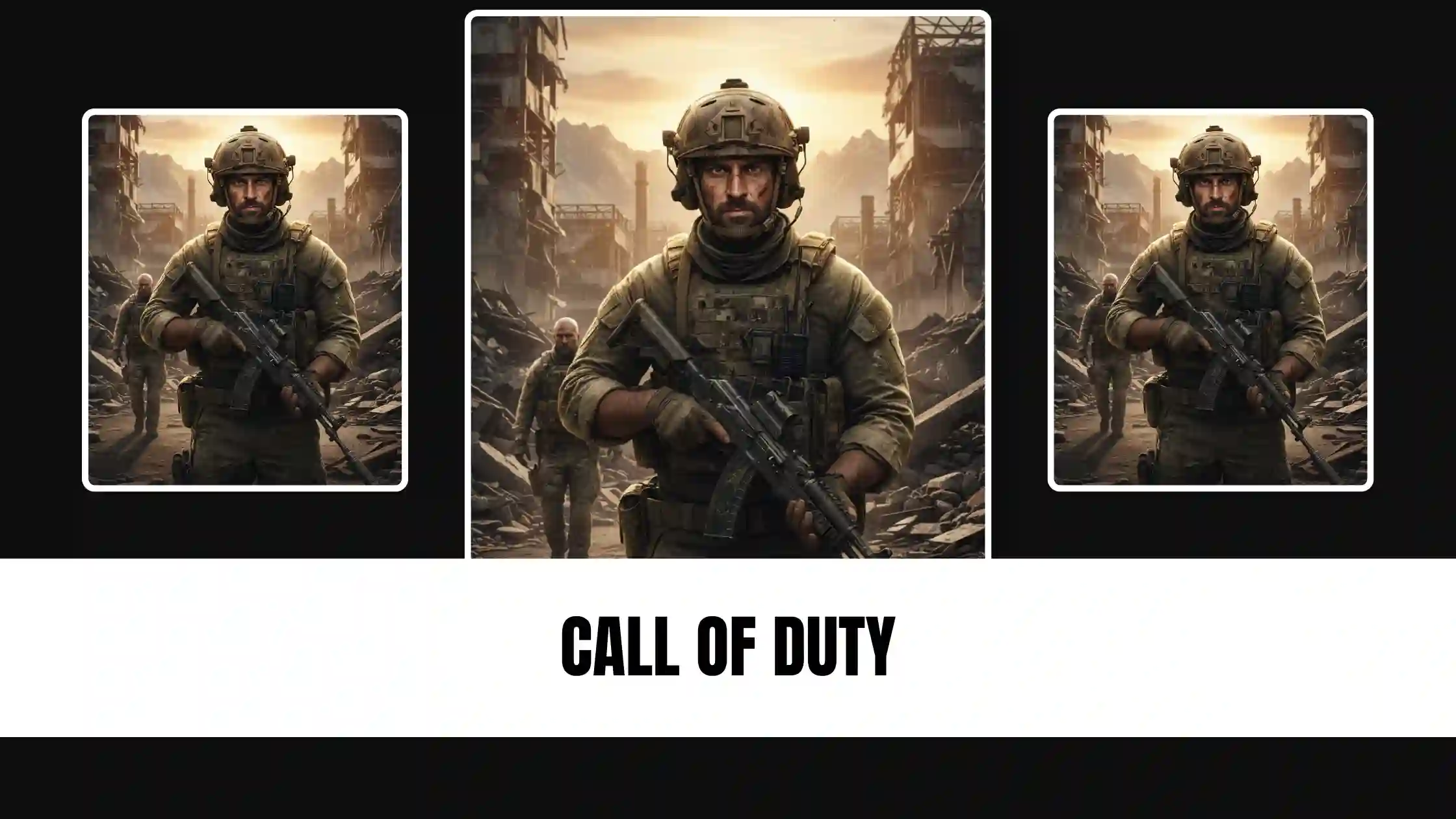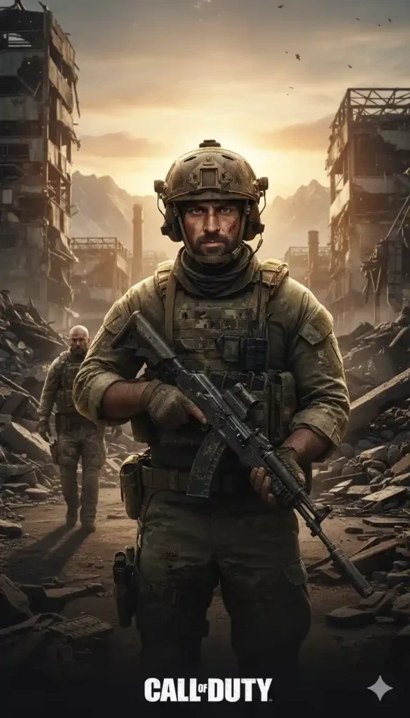 At the bottom center, the text [Call of duty] is displayed in its signature font. Rendered in a photorealistic style, high detail, sharp focus on the main character, cinematic depth of field, 64K resolution, widescreen [vertical] aspect ratio. Octane render & Unreal Engine 5.