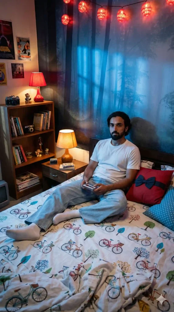 Create a cinematic portrait of the person in an attached cozy bedroom with a cinematic atmosphere and soft lighting. The person is wearing a white t-shirt, light-colored wide-leg jeans, and white socks. They are sitting cross-legged on an unmade bed with white sheets printed with colorful illustrations of bicycles, trees, and graphic elements. On the bed are pillows of different patterns, including a red pillow with a dark bow and another blue one with small dots.