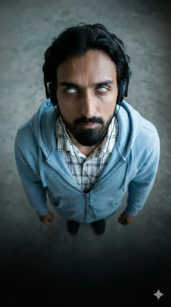 Create a dramatic portrait of the person in the attached image, viewed from above (high-angle), as if floating. They are wearing a light blue zip-up hoodie with a white plaid shirt underneath. They are wearing old Walkman-style headphones. Their eyes are completely white, giving a supernatural and deeply trance-like appearance. The facial expression is serious and concentrated. The light is soft and slightly cool, contrasting the pale skin tone with the vibrant hoodie. The background is blurred, resembling a concrete floor, reinforcing the feeling of isolation and suspense. The colors have a slightly desaturated tone, with a cinematic style, a tense and supernatural atmosphere. And a black gradient from bottom to top. High definition, rich skin texture, a feeling of levitation or loss of control, a mysterious and enveloping atmosphere.