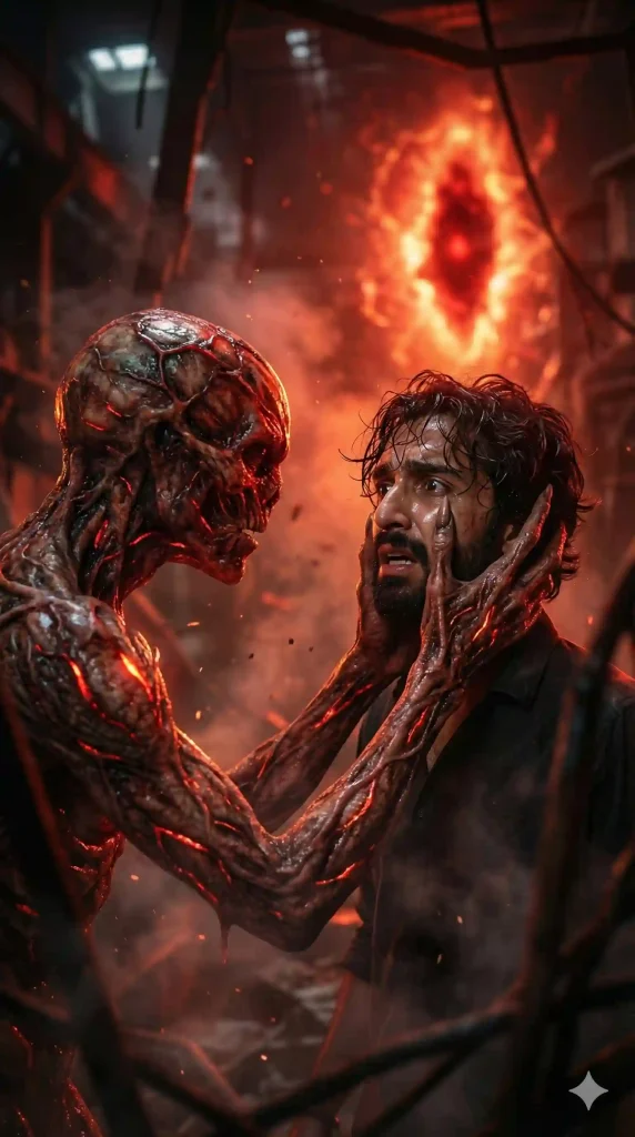 To the right, the monstrous creature (reference from the stranger things season) has a body entirely formed of twisted organic masses, exposed veins, textures reminiscent of dry roots, deformed muscles, and fleshy plates. Its skin appears to be made of burnt organic material, with glowing fissures in incandescent red. Long, bony fingers firmly grip the person's face, conveying menace and power.
