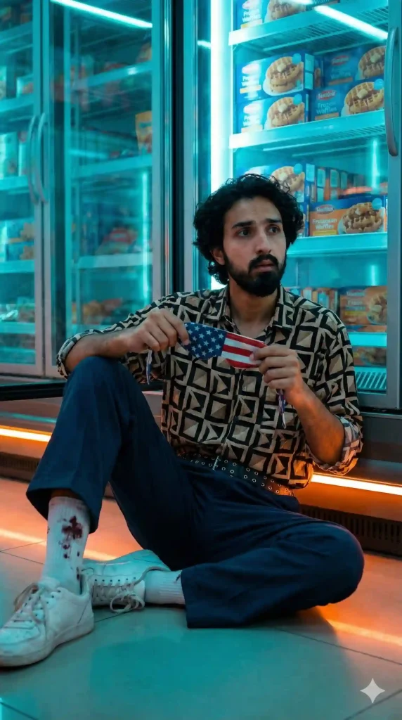 Create a cinematic portrait in a supermarket illuminated with turquoise-blue and orange neon lights. In the foreground, the person in the image sits on the floor, one leg extended forward and the other bent. They hold a blindfold made of fabric with a print of the American flag. Their face is frightened and illuminated by the cold ambient lights.