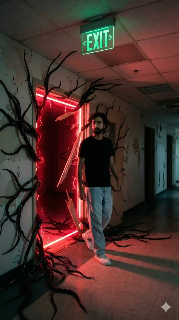 Create a cinematic and realistic image of an interior building corridor decorated like a supernatural horror scene. An ordinary door has been transformed into a macabre portal, surrounded by black roots and tentacles made of a shiny, twisted material that spread across the walls, ceiling, and floor. The portal itself emits an intense red neon light, creating a dramatic and menacing glow that illuminates the environment. The door frame appears torn, as if something has broken through the wall from the inside out. The interior lights create an atmosphere of a parallel dimension, with strong shadows and red reflections. The person in the image is emerging from the portal, wearing a black t-shirt, light blue baggy jeans, and white sneakers. Above the scene, part of the corridor's modular ceiling is visible, and a green exit sign adds contrast and realism to the environment. The composition conveys a sense of invasion, a 'portal to another dimension' style, with an aesthetic inspired by sci-fi horror, underworld creatures, and supernatural energy.